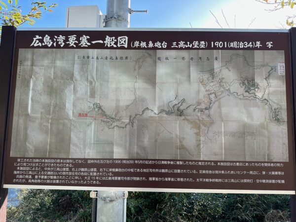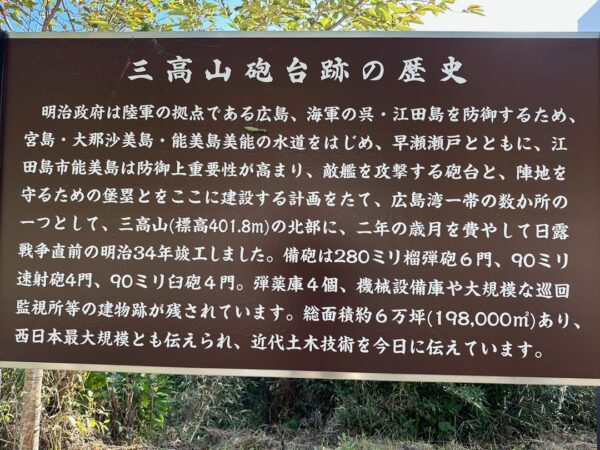 三高山砲台跡の歴史です。ここの砲台跡は西日本最大規模とも伝えられると書いてあります。
