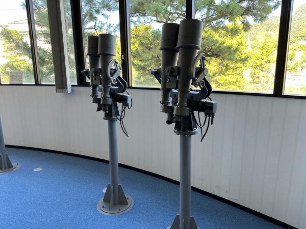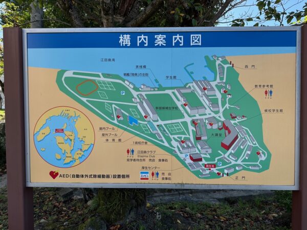 本日のメインイベントである海上自衛隊第一術科学校に来ました。ここは、ガイドさんが1時間半かけて内部を案内してくださるツアー(無料)を平日が3回、土日祝が4回開催しています。この11:15の回に参加しました。開始時間の30分前までは構内に入ることができないので、それ以降、中の一般車用駐車場に駐めて正門で受付をしました。