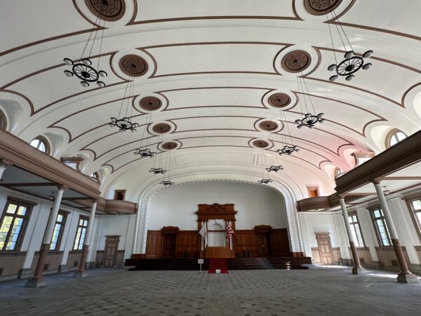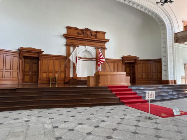 白い部分は菊花紋章をあしらったデザインになっていました。卒業式では、ここで卒業証書を受け取るものの、この紋章にお尻を向けることは許されないので、そのまま前を向いた状態で後ろに下がるのだそうです。