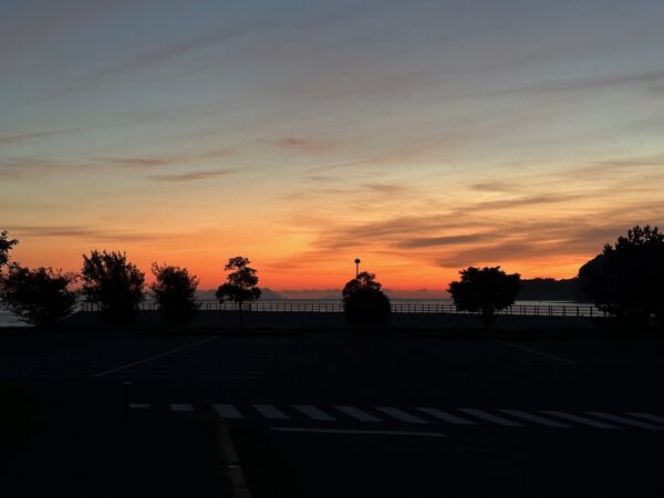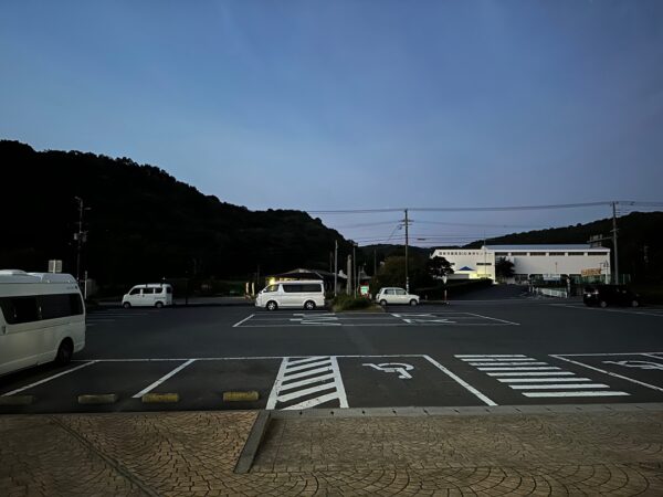 朝の様子です。車中泊をした普通車は7台でした。昨晩から朝の6時まで、この写真の中央にエンジンをかけたままの大型トラック(保冷車でもなし)が駐まっていました。うるさいのは我慢するとしても、排気ガスがこちらに流れてくるのは健康に悪そうなので、エンジンを切って毛布に包まるとかしてほしいと思いました。