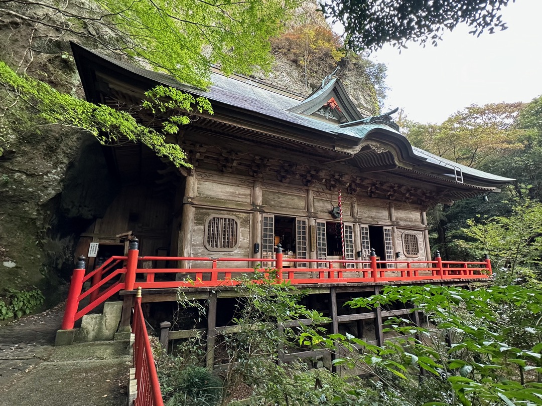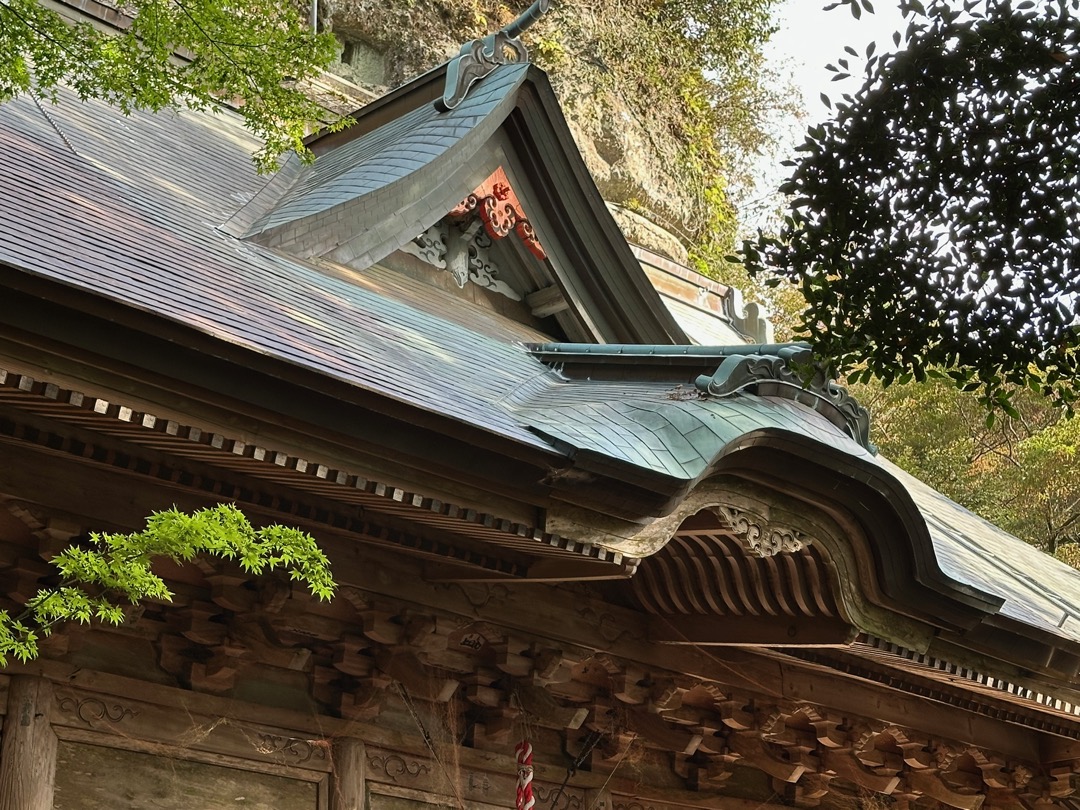 銅板葺きの入母屋造が岩にめり込んだ形になっています。