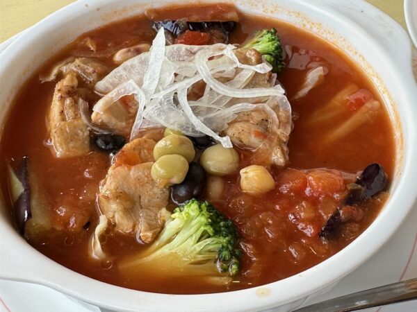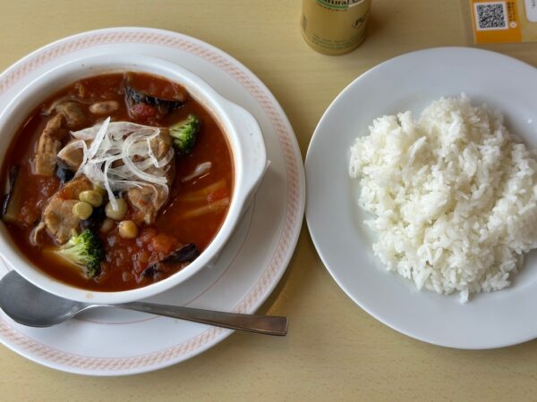 野菜とお豆がたっぷりグリルチキンのトマトスープセット(ライス)878円です。