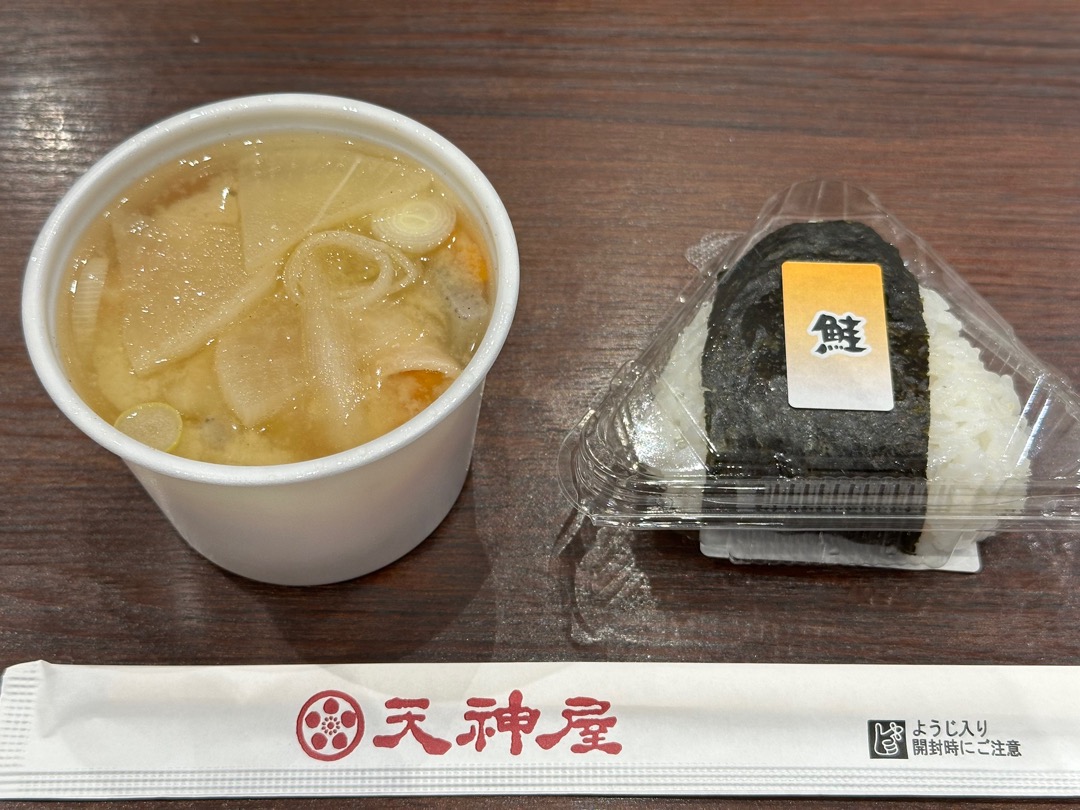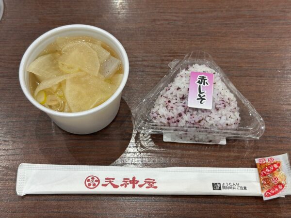そこで、トラックドライバーさん御用達の天神屋 ドライバーズスポットで買いました。ちなみに、このお店にはシャワーがあります。手むすび赤しそ160円、具だくさん豚汁276円です。