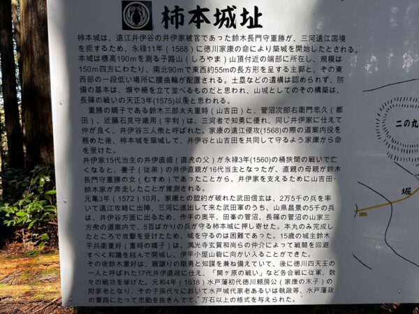 柿本城は井伊氏の支城で、井伊谷三人衆のひとりである鈴木重時によって築かれた城です。元亀3年(1572年)に武田信玄の軍勢によって攻められ落城しました。