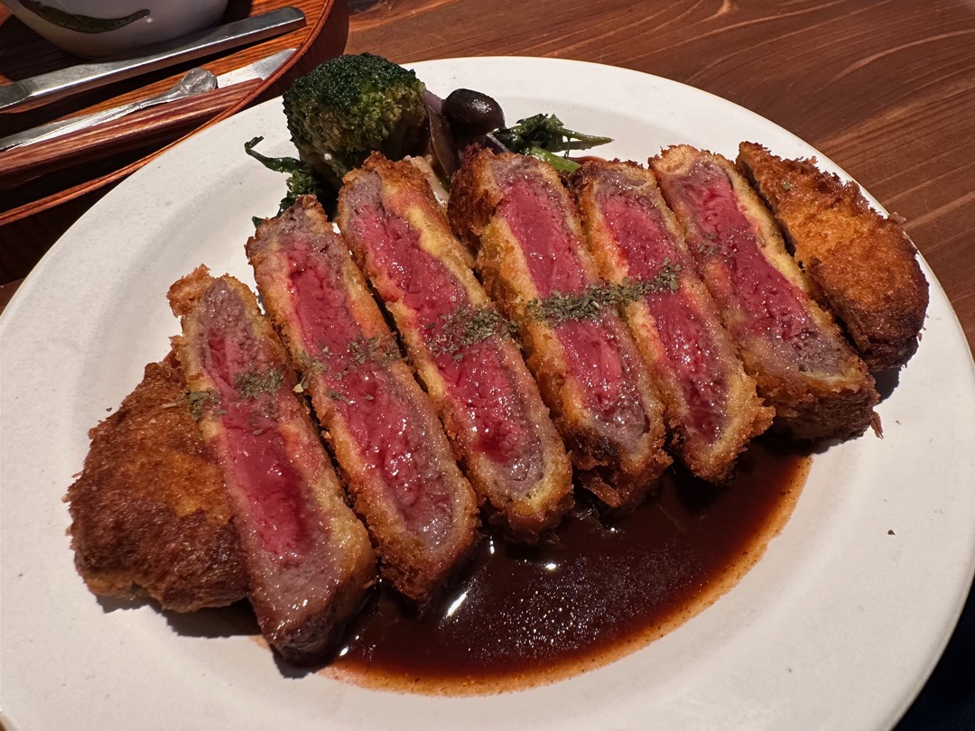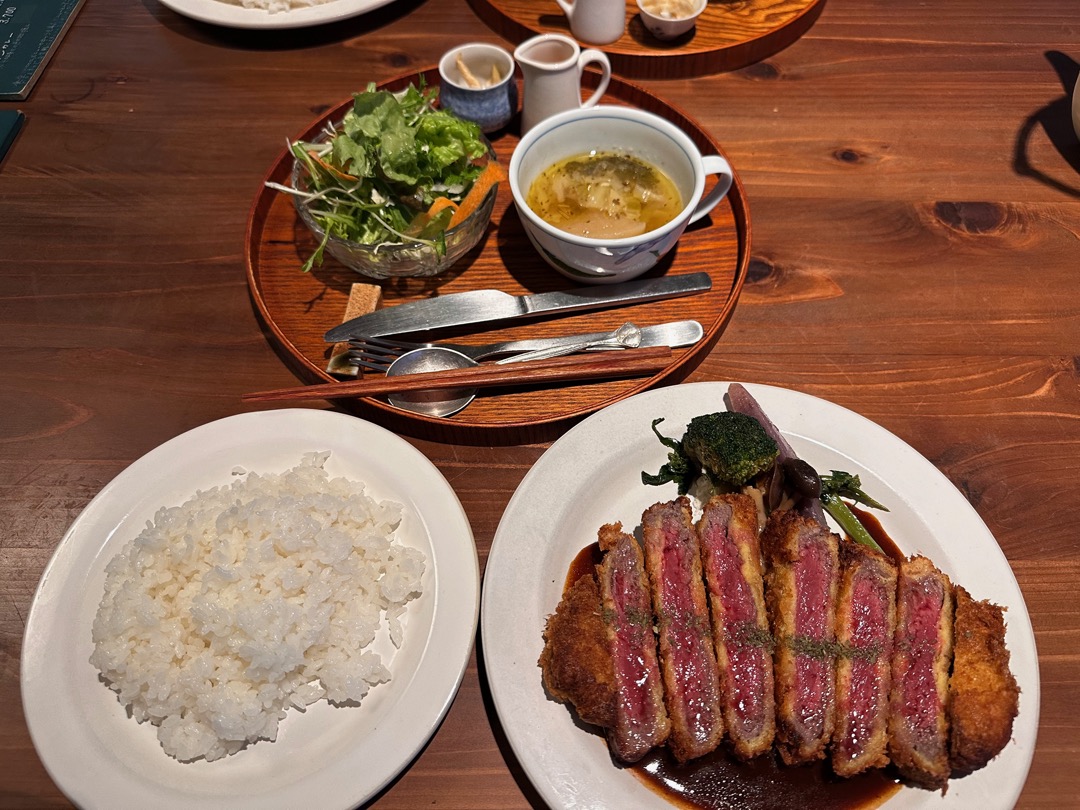 このような本格的なビーフカツレツは初めていただきました。柔らかくて、今までに食べたことがない料理でした。美味しかったです。しかし、カツは、やはり豚肉の方が適していると思いました。以前、牛骨ラーメンを食べて、世の中は豚骨ラーメンがあるのに、牛骨ラーメンがないことに納得したのと同様、カツは豚肉に限ると思いました。でも、一度は食べてみられることをおすすめします。その価値は十分ある味です。