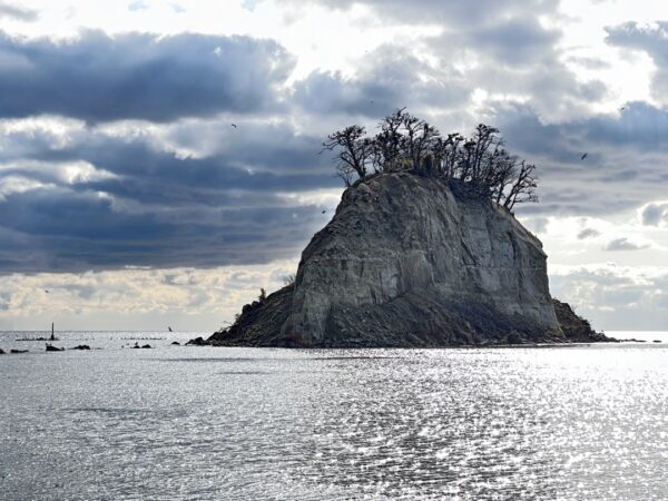令和2年(2020年)11月24日に、ここに来た時の写真です。別名、軍艦島と呼ばれるこの島は、垂直に切り立った壁の上にふさふさとした髪の毛のように木が生い茂っていました。ところが今の姿は、寂しいものがありますね。この島は七輪の材料になったりする珪藻土で出来ています。そう言えば珠洲市は七輪の産地でもありました。