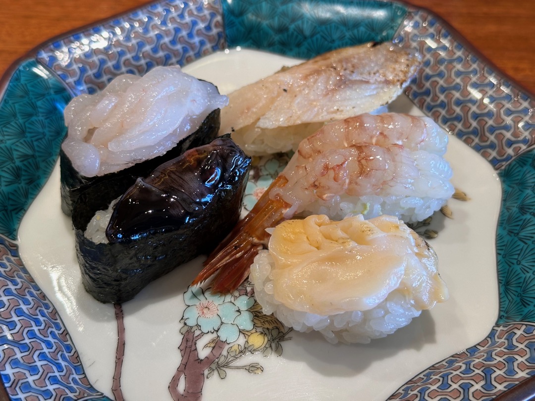 せっかく北陸に来たことだし、「能登の美味しいものを食べて能登を応援しようキャンペーン」と題し、清水の舞台から飛び降りました。北陸五点盛り(「白身のトロ」と称されるほどの圧倒的な脂のりと、深海に近い場所に生息し漁獲が難しいことによる希少性が特徴のどぐろ、北陸・山陰地方で水揚げされる甘えび以上に濃厚な甘みと旨味を持つ希少な「幻のエビ」がすえび、梅貝、ほたるいかの黒造り、上品な甘みと香りが口いっぱいにひろがる富山湾の名産 白エビ)2,120円です。