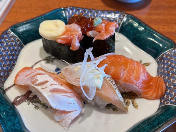 このペースで食べていると、ご満悦おばさんが、ご立腹おばさんに変身されそうな感じでしたので、ちょっと落として、サーモン五点盛り1,090円