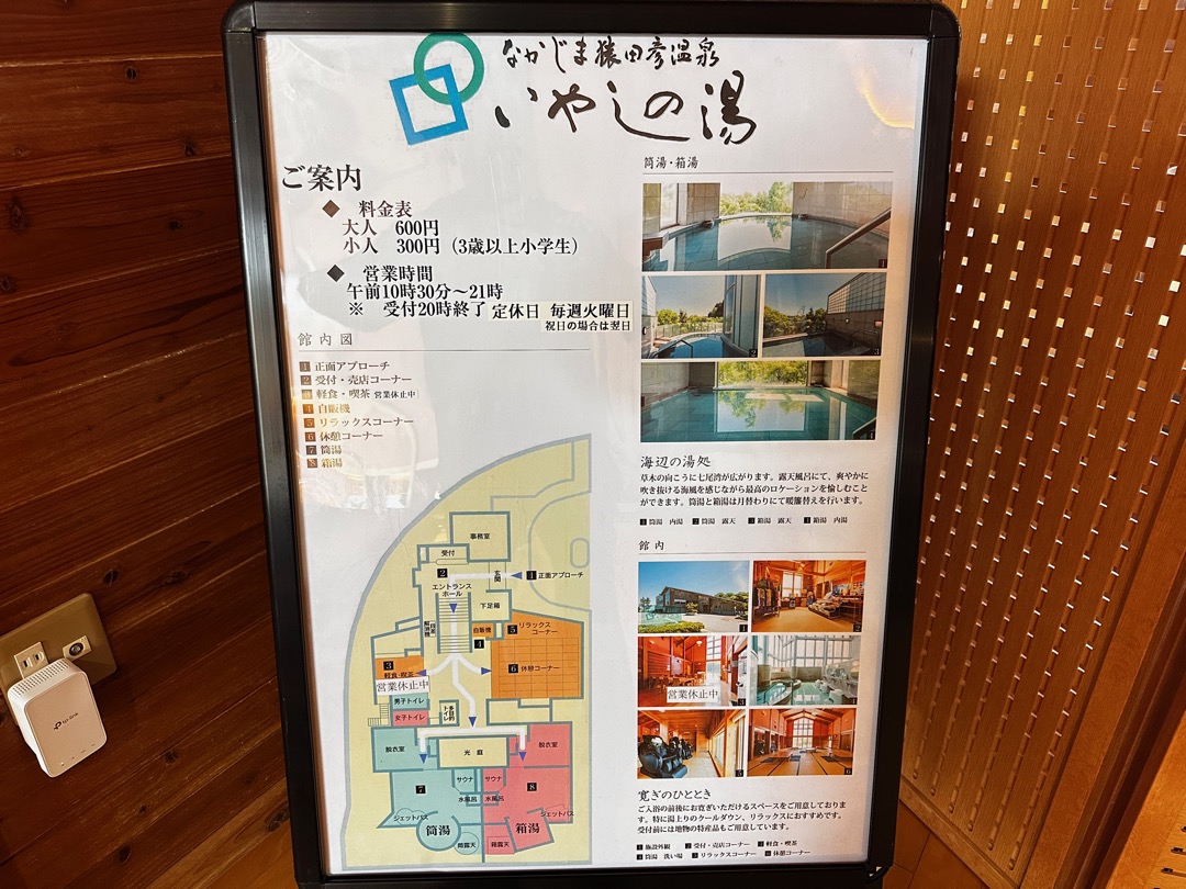 温泉諸元 泉質:ナトリウムー塩化物強塩温泉(高張性 中性 低温泉)、加水 不明、加温 不明、濾過循環 不明、消毒 不明、pH7.3、源泉温度 31.0℃、メタけい酸 91.6mg、炭酸水素イオン 128.0mg、ラドン ーx 10^-10Ci/kg、内湯2(φ5m、5㎡)、露天1(6㎡)、サウナ1(ドライ 8人、2段、水風呂1、洗い場14ヶ所、とろみ度 なし、気泡 なし
