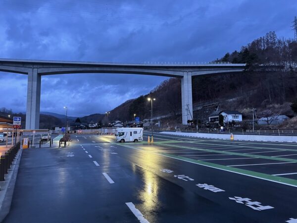 道の駅のトイレから戻る途中に軽のワンボックスに乗られている方から声をかけられて少し話しました。工事現場の交通整理をされる警備員さんで、これから仕事に行くにあたって待ち合わせをされているところでした。