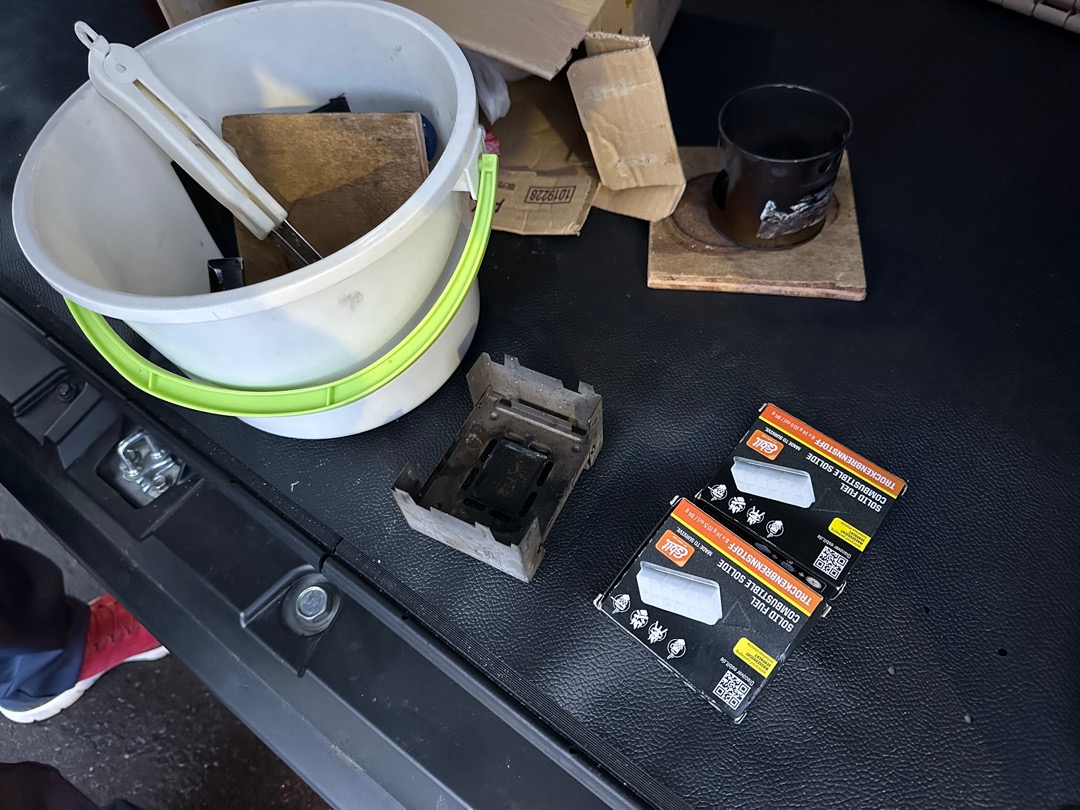 車を車中泊できる仕様にしているとのことで、少し見せていただきました。僕は知らなかったのですが、エスビットという固形燃料があり、これで、ご飯を炊いたり、焼き肉をしたりされていました。これまで車中泊仕様の軽ワンボックスを見せていただいたことがありますが、車の中にあるものは、車中泊をするためのものばかりでした。しかし、この方の車は、中に工事現場にあるコーンなど仕事の道具が置いてあり、その横で就寝できるようにされているのには驚きました。