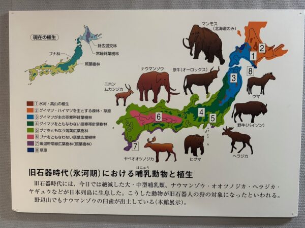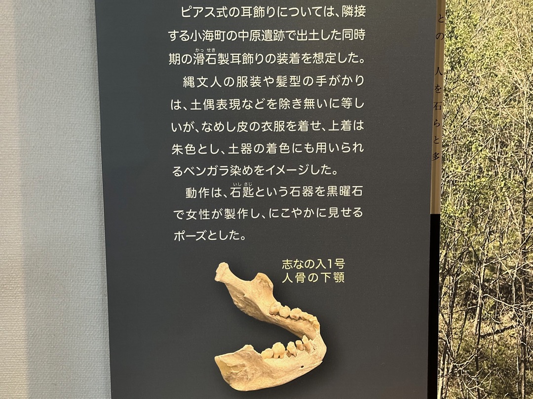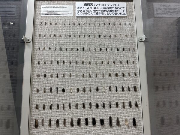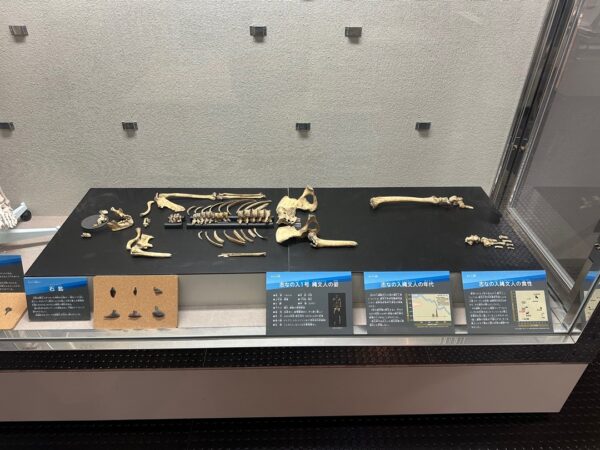 最初に簡単に展示物の説明をしていただきました。ここは、日本で、最初に細石刃が見つかったところなのだそうです。また、約5,600年前の縄文人の人骨(現物)が展示されており、その人骨の形態特徴をもとに復元した生体模型も展示してありました。実際に約5,600年前に生存していた人の骨が今、目の前にあると思うとすごいことだと思いました。