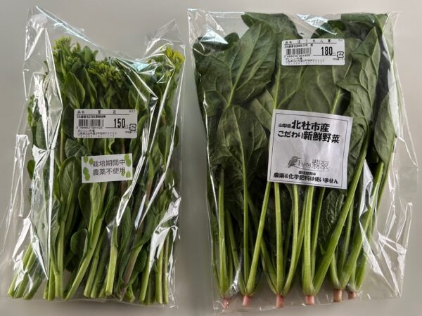 栽培期間中農薬不使用の菜の花とほうれん草です。家にいる時に、このような野菜を売っているところが近くにあったらいいなぁと思いました。
