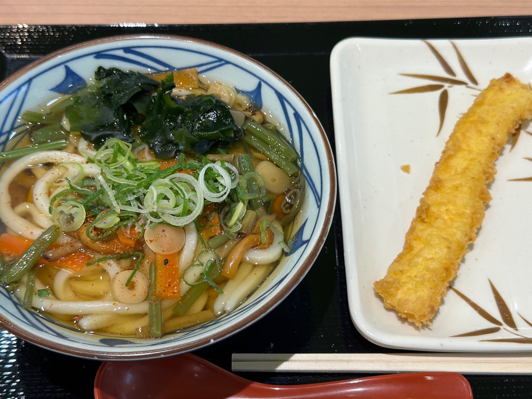 今日のご満悦おばさんは、丸亀製麺ラザウォーク甲斐双葉の山菜うどん(並)640円、イカ天190円、計830円です。