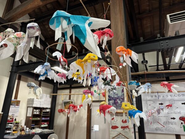この金魚ちょうちんは、この時期だけではなく年間を通して飾ってあるそうです。祭りの時期になるともっと増えるらしいです。和紙でできており、塗料を使って着色するために雨に濡れても大丈夫なのだそうです。