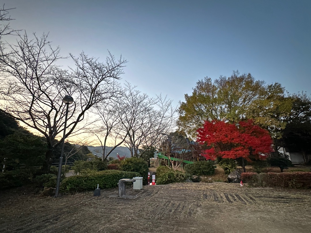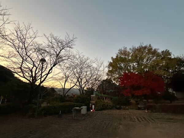 今朝の道の駅です。晴れました。暗い中でラジオ体操をやっているとだんだん明るくなってきました。もみじが赤いのですが暗くてわかりませんので、少し明るめに撮りました。