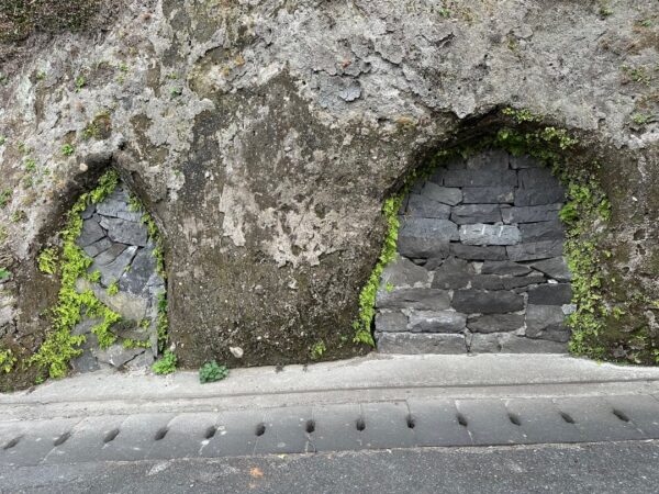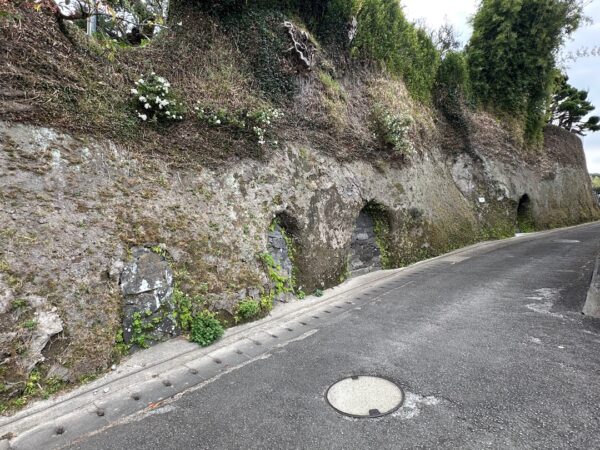 城下町臼杵はきれいな石畳になっていました。典型的な溶結凝灰岩で軽石が溶結したものを含んでいました。