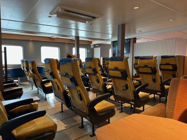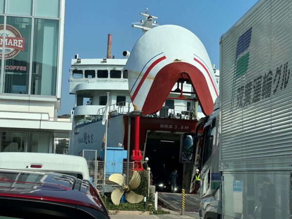 前を開けて、車両を降ろすのに約7分、10分前から乗船開始して定刻に出港しました。(車は、ほぼ満車でした)
