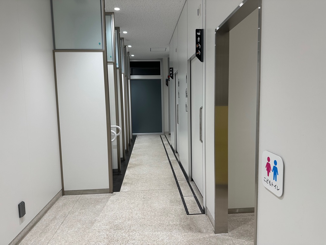 トイレは建物の西側(別府側)にあります。小5、大3(洋3 洗浄便座付き)です。コロナを経験したあとに作られたトイレだからか小便器の間に仕切りが設けてありました。これと同じくらいのトイレがすぐ隣りにあります。ただし、そちらは夜、シャッターが降りていました。