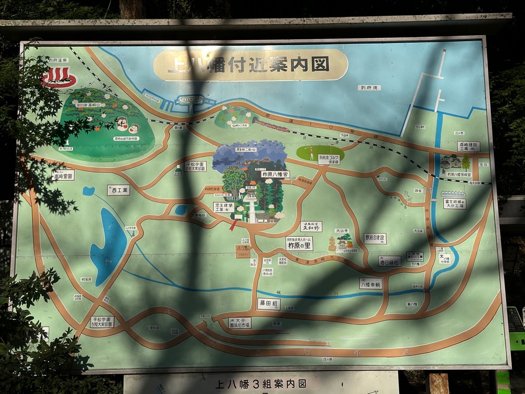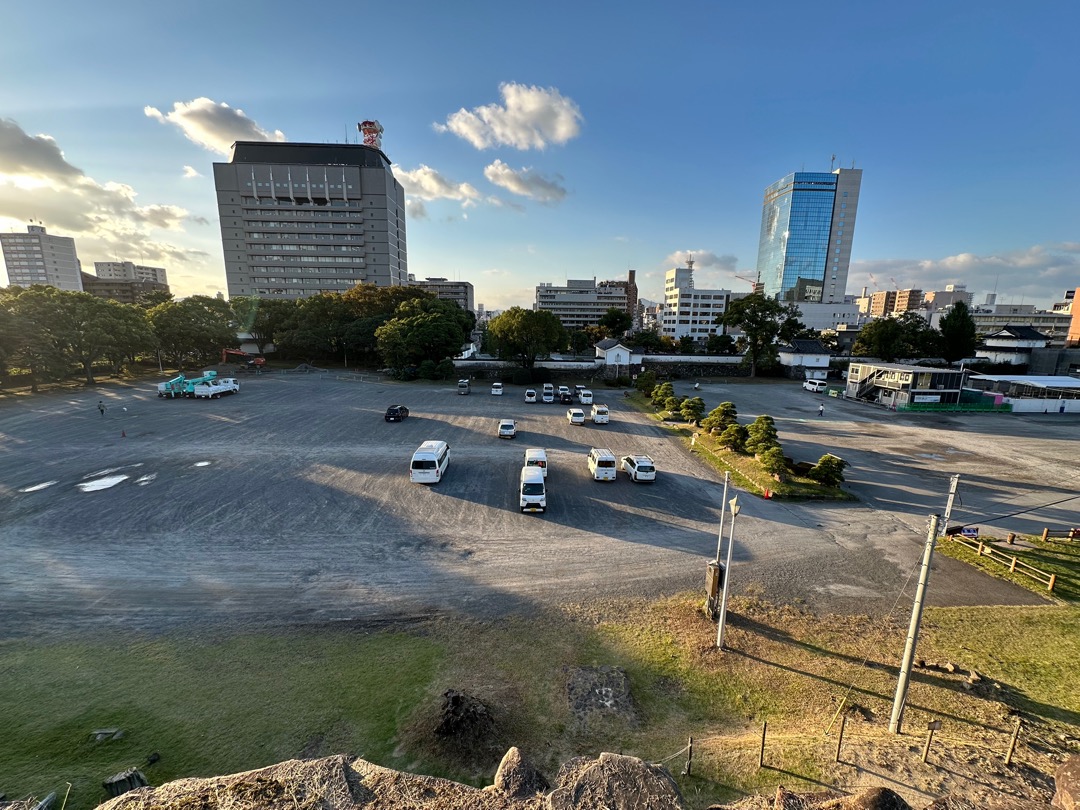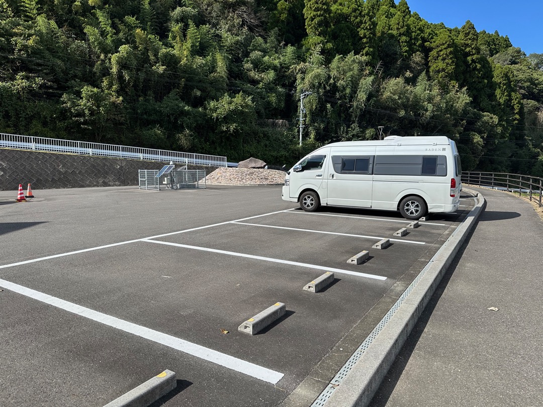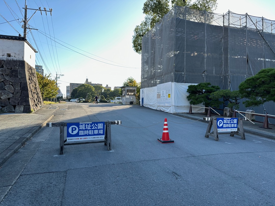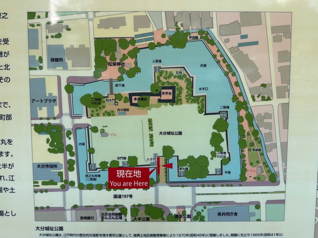 大分城址公園臨時駐車場(無料)に駐めました。大分城址公園臨時駐車場の矢印にしたがって入ってきましたが、ここは工事の作業をされる方が駐める駐車場だったらしく、僕らが駐めたあと作業の方々が出勤されると入口が閉まってしまいました。