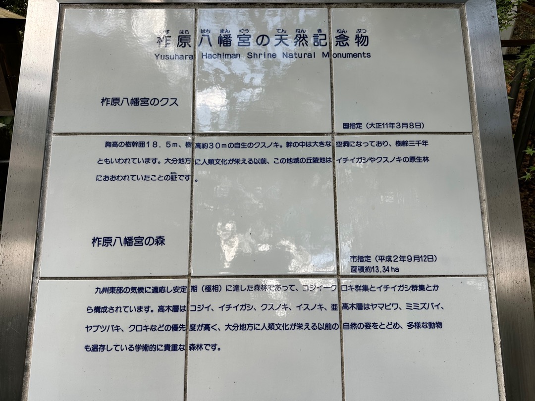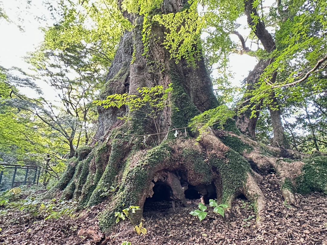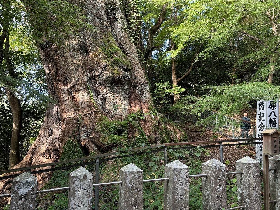 柞原八幡宮の大楠です。樹齢3000年で、日本のクスノキの幹周りランキングで第8位になる大楠です。大きさが伝わりにくいと思いましたので、特別にイケメンの兄さんに立っていただきました。ほぼ真横になりますので比較できると思います。