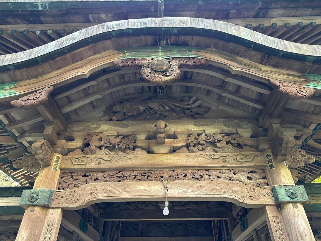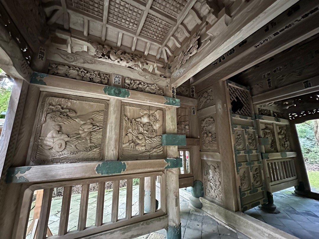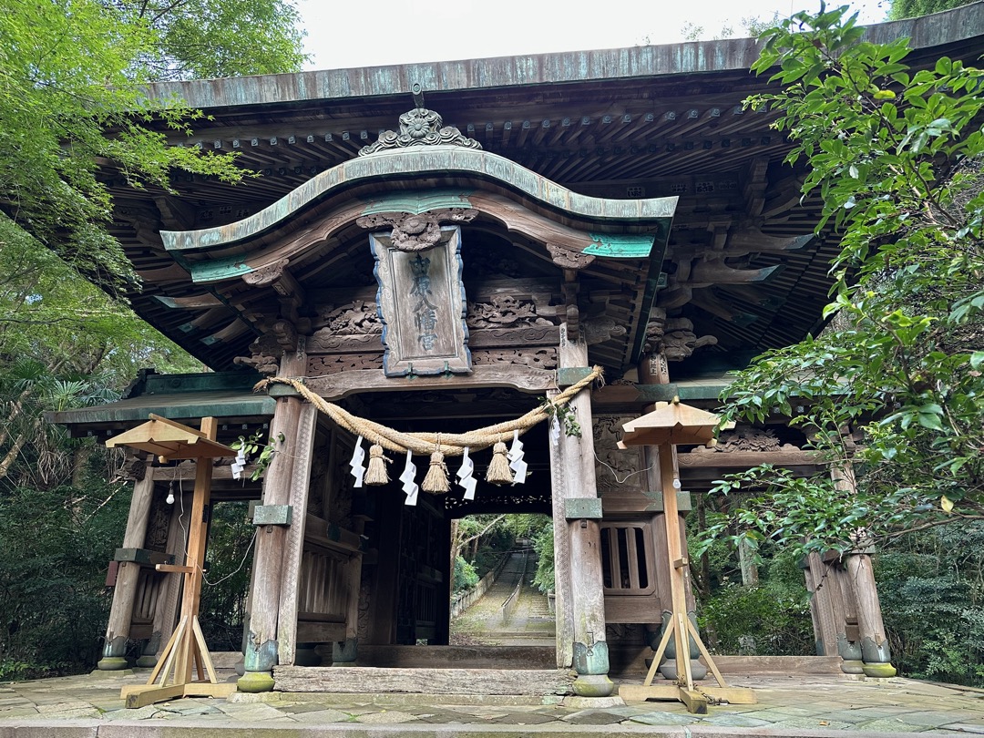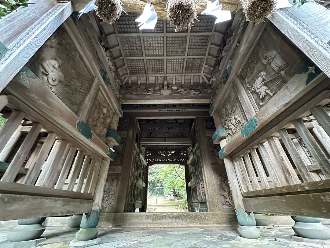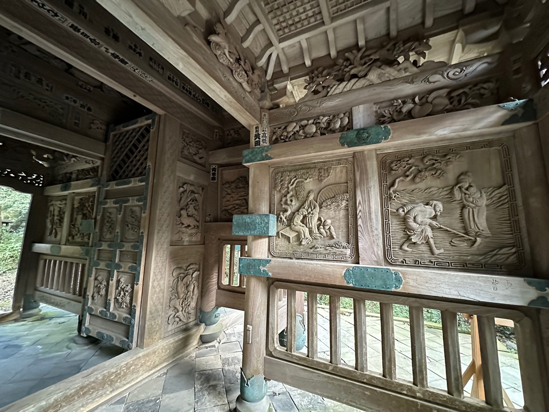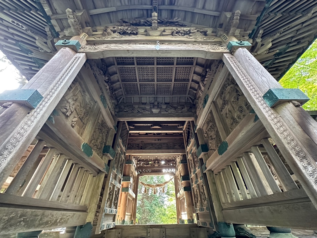 このクスノキ以上に驚いたのが、この南大門と呼ばれる門です。銅板葺入母屋造の八脚門の前後に唐破風向拝が付いた門と言えばよいのでしょうか。さらに随所に透かし彫りが施してあり、すごいという形容詞を使っても有り余るすごさを放っていました。