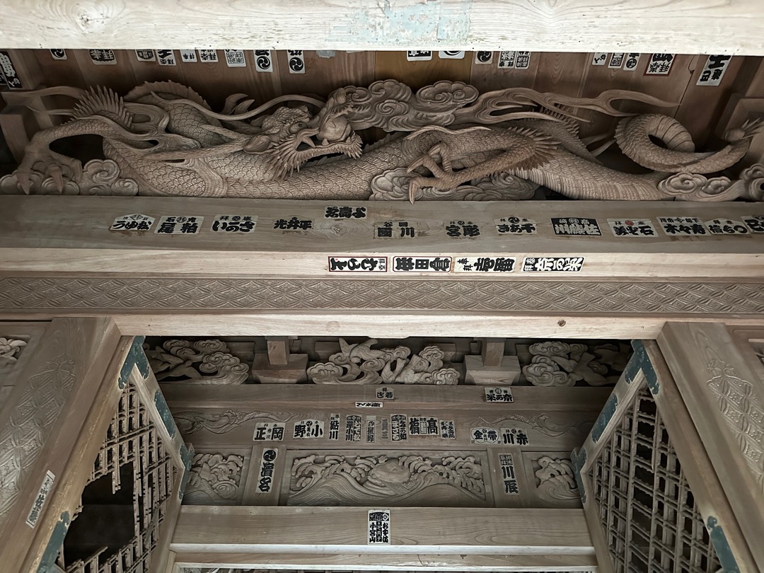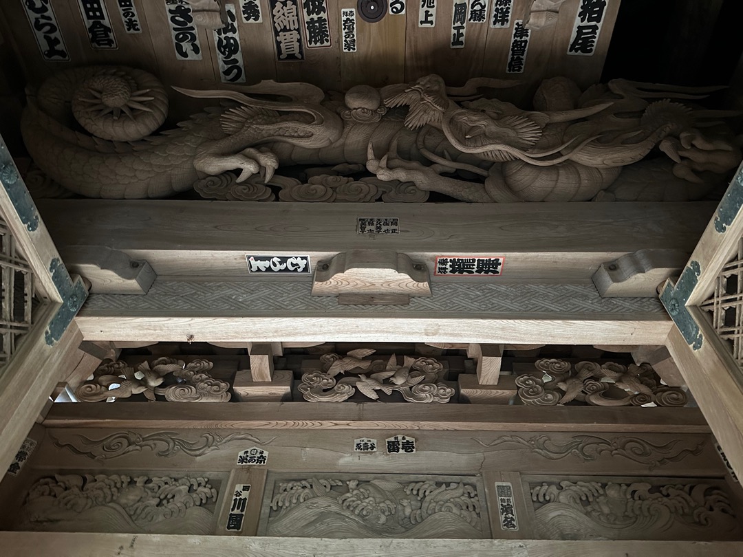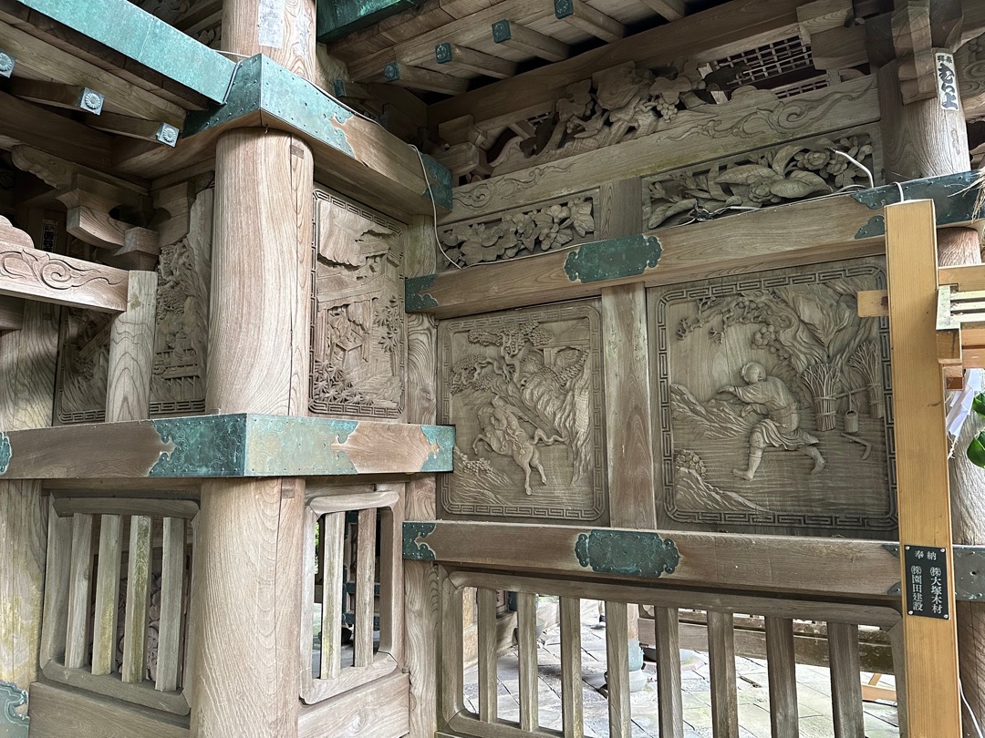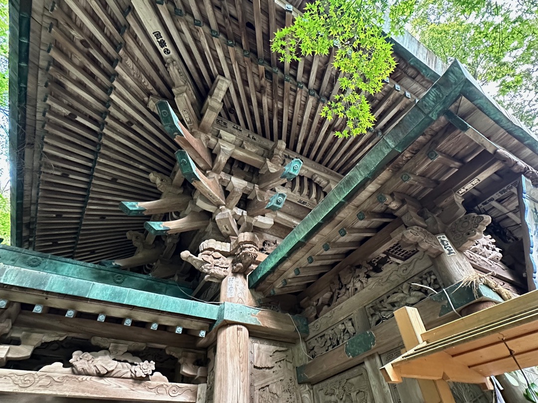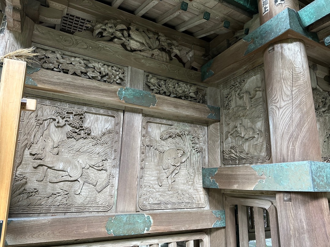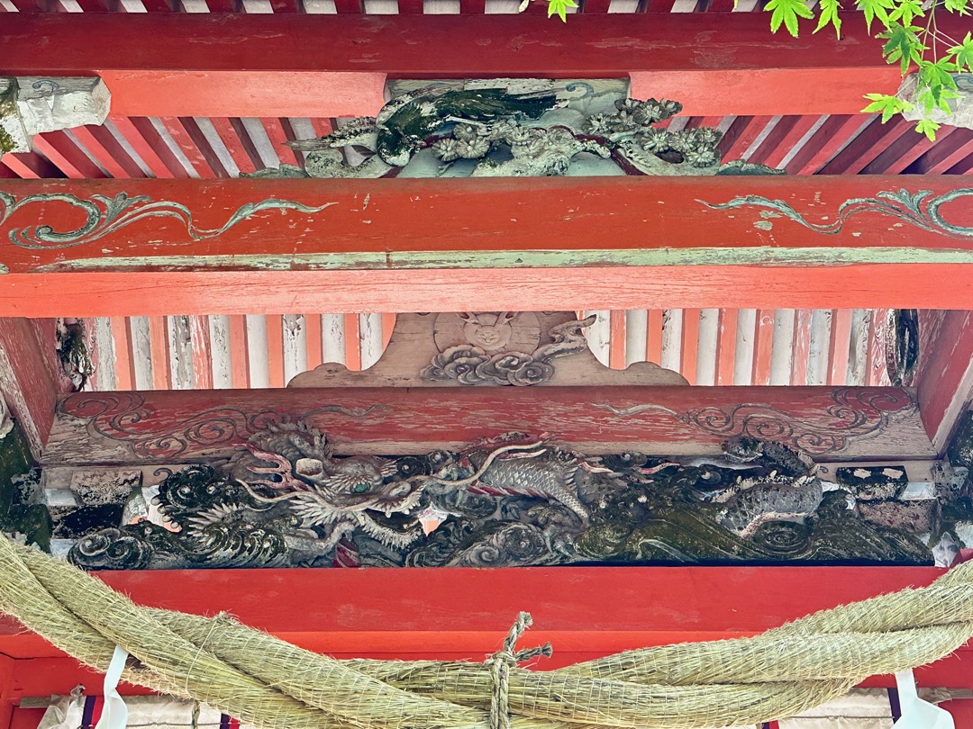 このクスノキ以上に驚いたのが、この南大門と呼ばれる門です。銅板葺入母屋造の八脚門の前後に唐破風向拝が付いた門と言えばよいのでしょうか。さらに随所に透かし彫りが施してあり、すごいという形容詞を使っても有り余るすごさを放っていました。