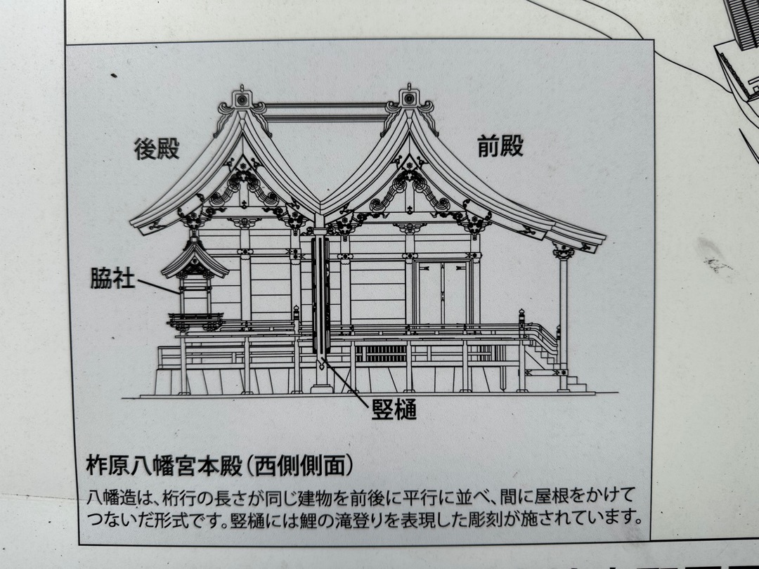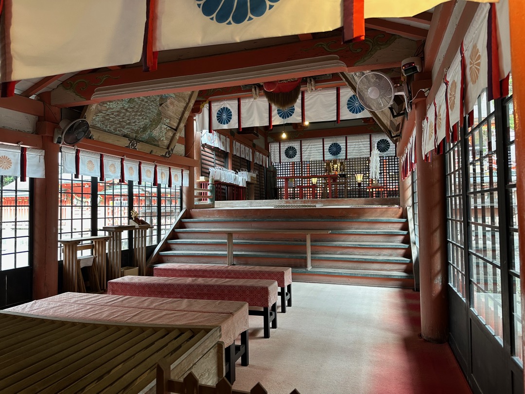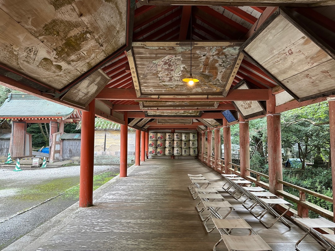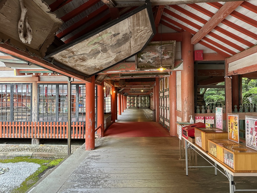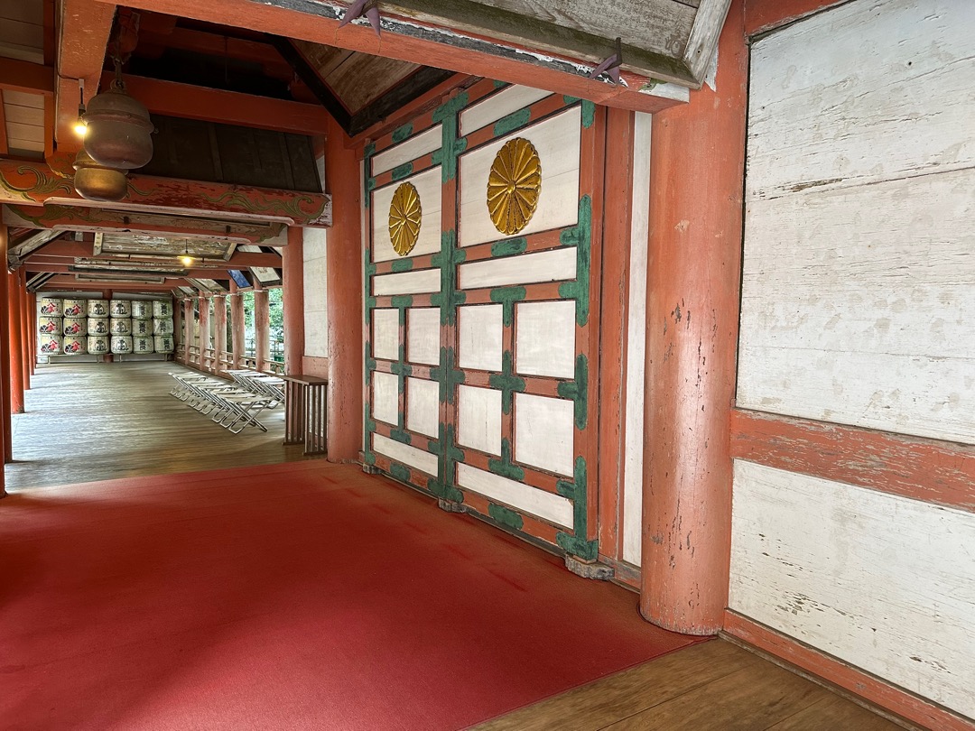 ここから入ることはできず、西門に周り中に入りました。回廊に上がり拝殿から参拝するのですが、申殿(もうしどの)と呼ばれる建物が八幡造の本殿と拝殿の間にありました。
