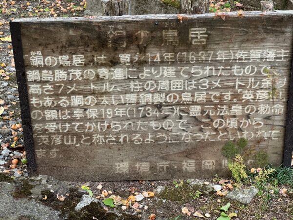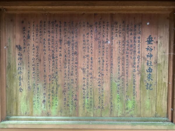 垂裕神社の由来です。ここは、黒田長政の三男である黒田長興公を祀る神社であること、昭和になって、島原の乱や大東亜戦争の戦没者が合祀されたことなどが書かれています。