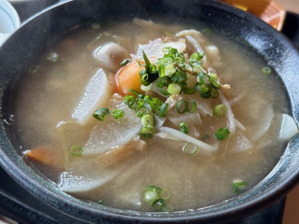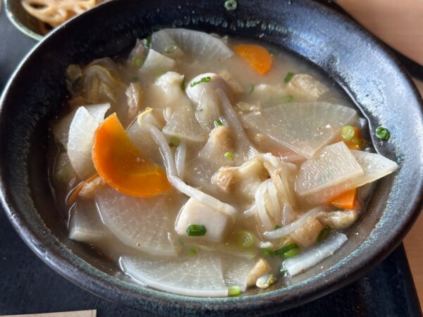 少し、お汁をいただいた状態です。いろいろ入っているのがわかると思います。野菜の味がしっかり出ている優しいお汁でした。
