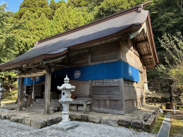 本瓦葺入母屋造平入りに桟瓦葺の切妻向拝が着いた拝殿です。