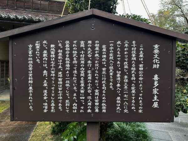 加賀藩主 前田家は、外様で100万石という規模の藩なので徳川からあらぬ因縁を付けてお取り潰しにならないようにとても気を遣っていたそうです。特に、このあたりで頻繁に起きる一揆には配慮をしたようです。年貢の徴収をもとに、藩と農民との間にいざこざが発生しやすいので、その間に庄屋と代官の役目を果たす役割を置いたところが加賀藩の特有のやり方だったらしいです。それを十村役といい、そのひとつがここ喜多家でした。