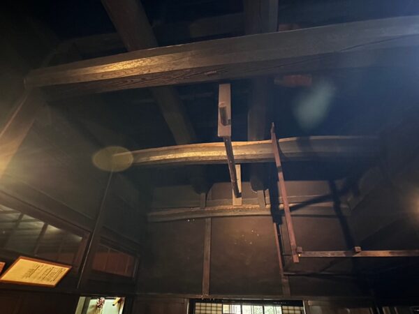 加賀藩は、天井を張ることを嫌っていたそうです。それは隠し部屋を造られると良からぬことを画策する場として使用されるからです。よって、一箇所を覗いて天井がありませんでした。