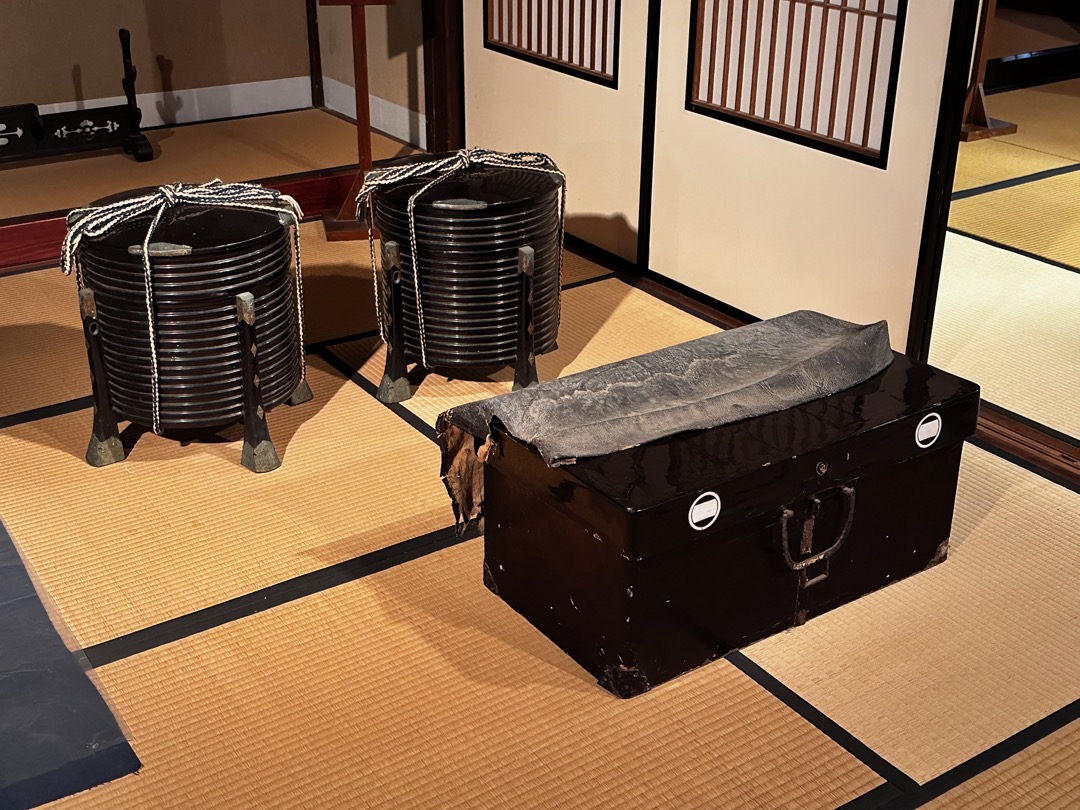 手前は、殿様のスーツケースに相当するものだそうです。奥はお祝いのお餅を入れる入れ物で、雛段飾りには必ずあるとおっしゃってました。今度、注意してみてみたいと思います。