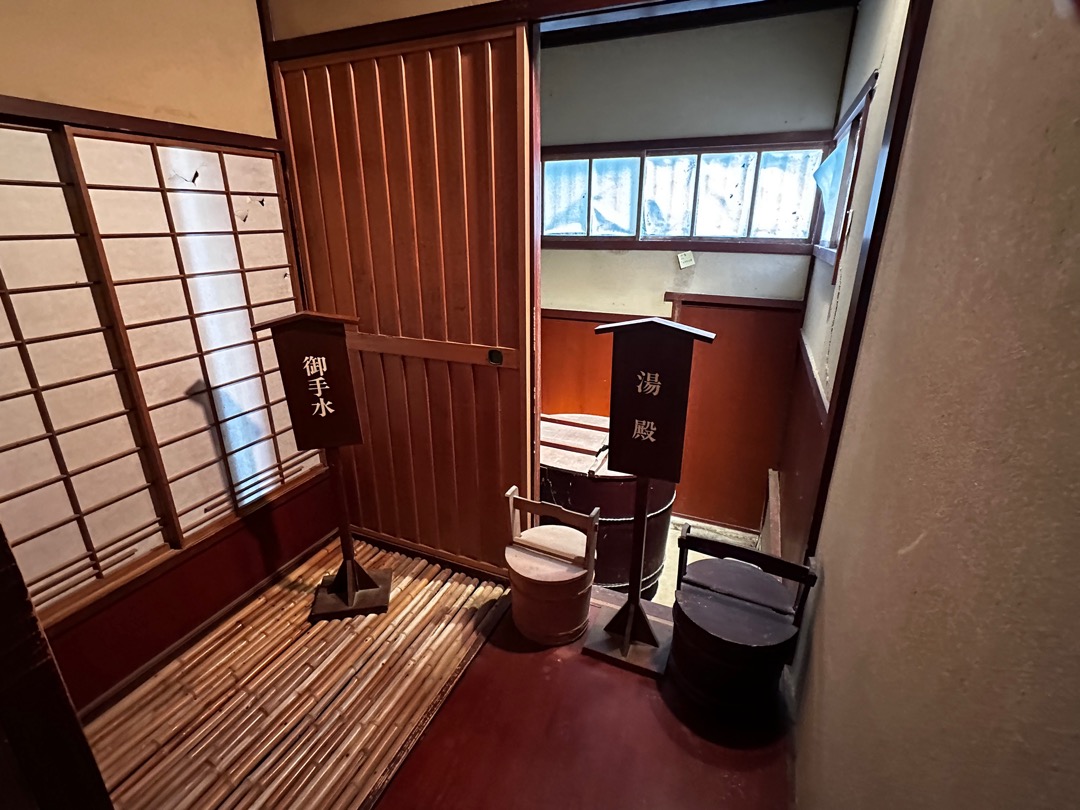ここは、殿様用の湯殿です。御殿様がお風呂に入る時に肌に異物が着かないように風呂桶の周りに白い布を敷いていたそうです。その布が「風呂敷」の語源になっているとのことでした。左は夜専用のトイレで、持参された携帯用のトイレを置いて使っていたそうです。