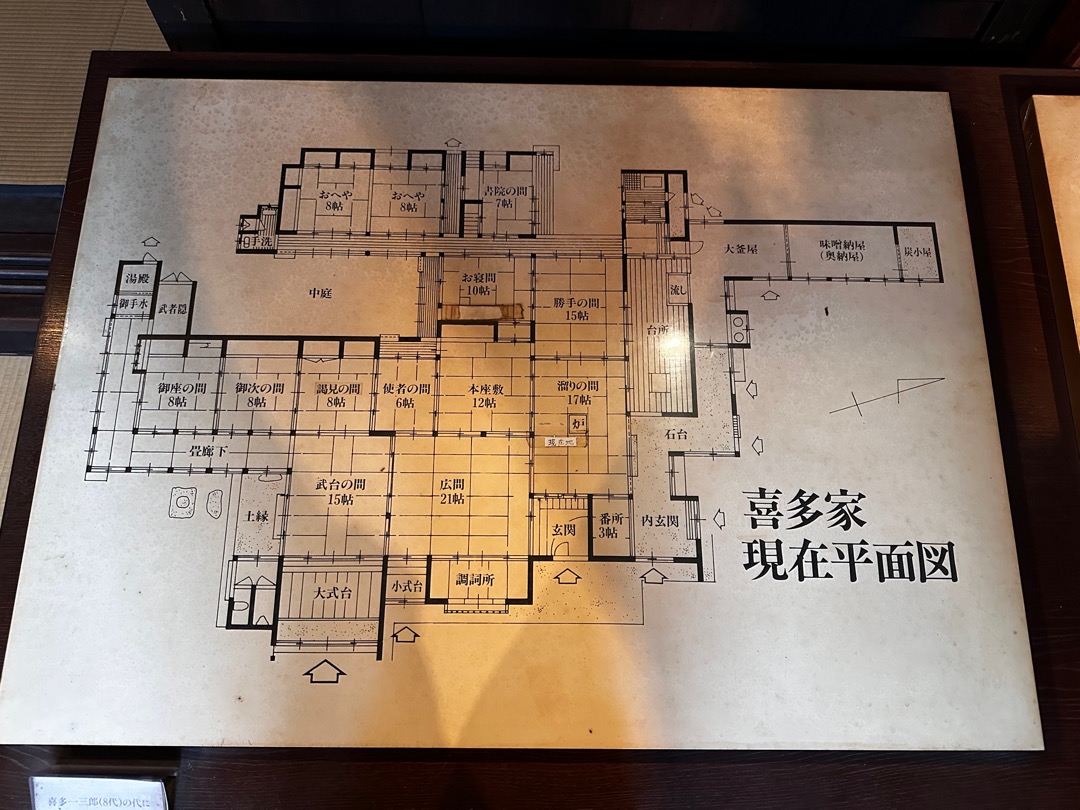 この喜多家については、こちらの説明をご覧ください。ガイドさんの説明の中で、「私ども喜多家」という表現をされるので、失礼ですがと伺ったところ、28代目の当主であることがわかりました。
