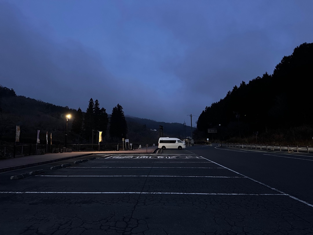 こちらには、僕らの車だけでした。雲がありますが、これから晴れそうです。それにしても、真っ暗な朝ですね。