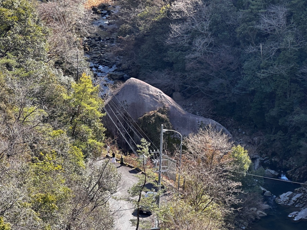 あれ、橋の下にあるじゃん。どうやら、今回駐めた駐車場ではなく、この岩の近くの駐車場に行かないといけないようです。しかし、思っていたほど大きな岩でもないので、橋の上からの拝見でよしとしました。
