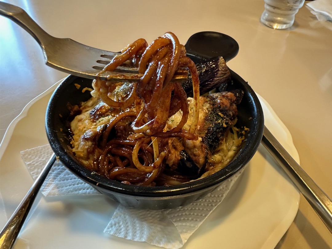 写真がうどんみたいに見えますが、パスタです。味は、甘めの焼きそばソースにデミグラスソースを混ぜたような味なのだそうです。これは、「グラタンではなく、パスタだ」など、いろいろ言いながら召し上がっておられましたが、要約すると「美味しかった」とのことでした。