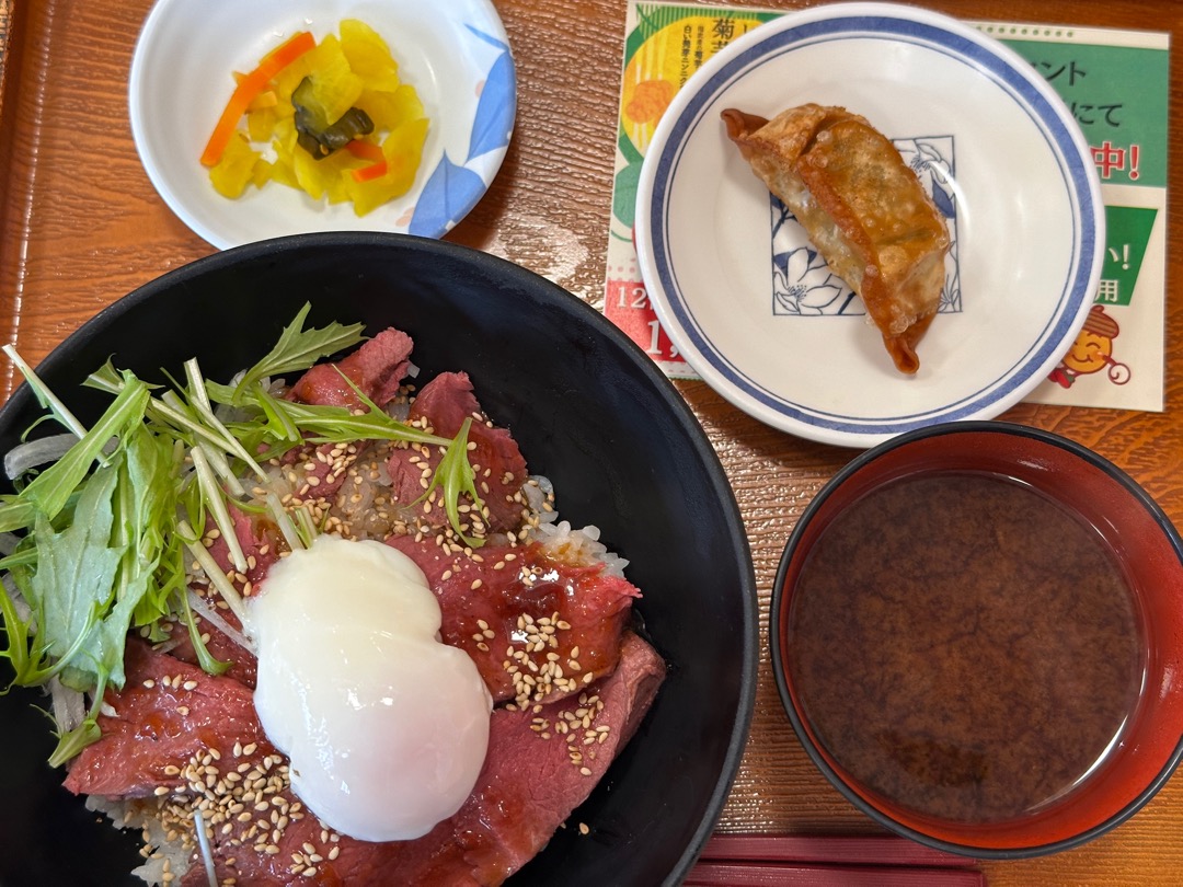 ロースト鹿丼(白米)1,700円です。右上の餃子は稲武産の菊芋と白い発芽ニンニクを使用した餃子で、ここの名物のようです。このお皿の下にある紙に書いてあったのですが、すでに食べてしまった後でした。