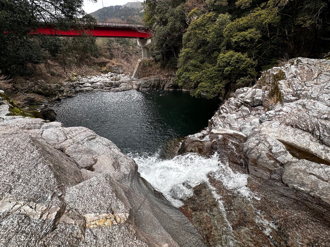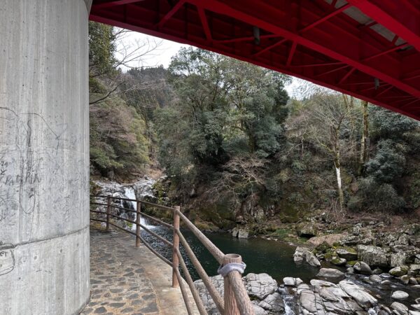 赤く塗られた滝見橋と無彩色の岩が映えますね。