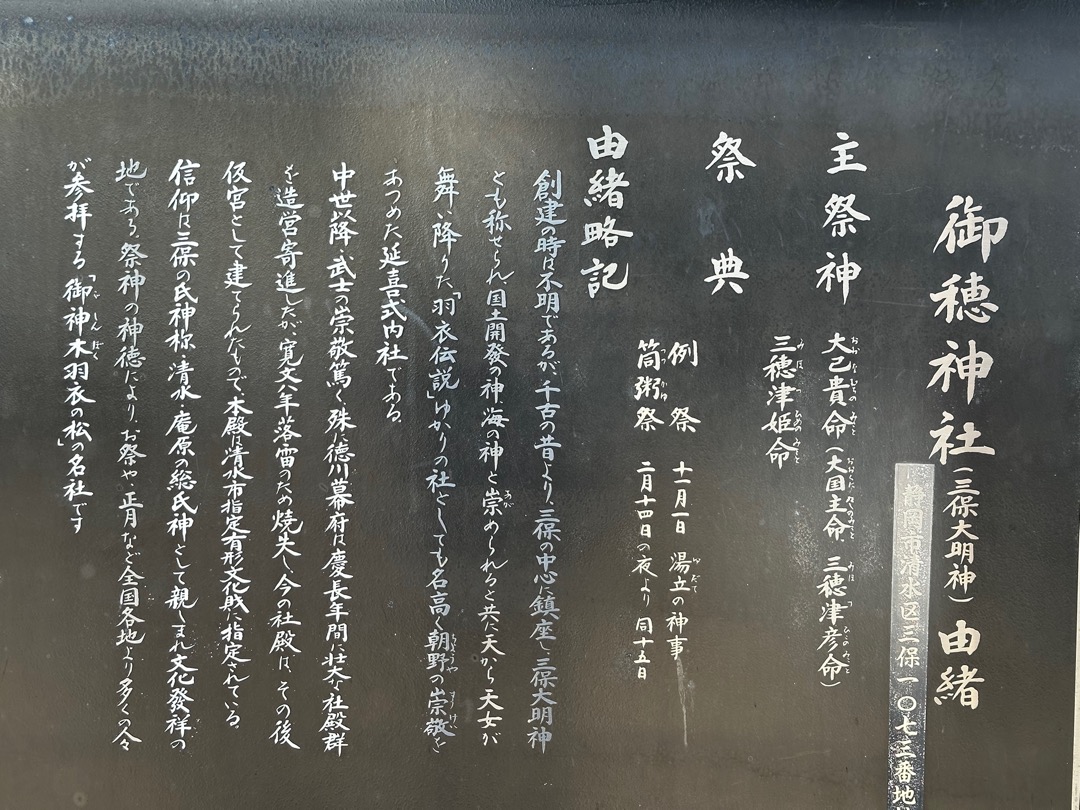 主祭神は、大己貴命(大国主神)と三穂津姫命と書かれています。三穂津姫命については、よく存じ上げていなかったのですが、大己貴命(大国主神)の后になる神様だそうです。三保松原の「みほ」は、三穂津姫命から来ているのでしょうかね。