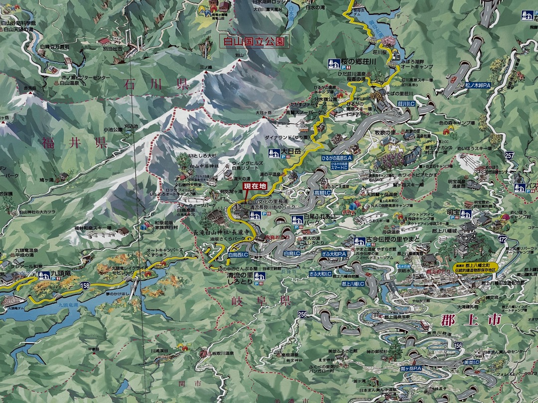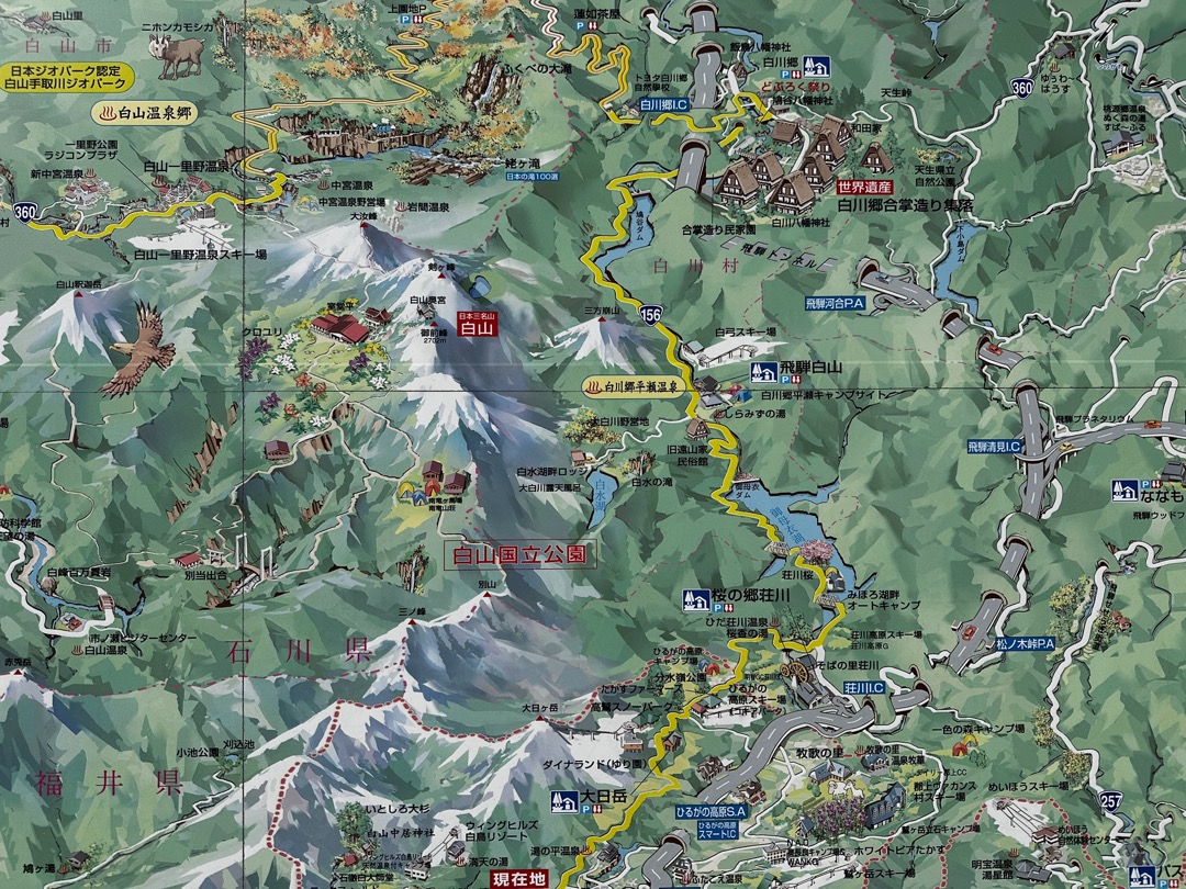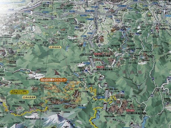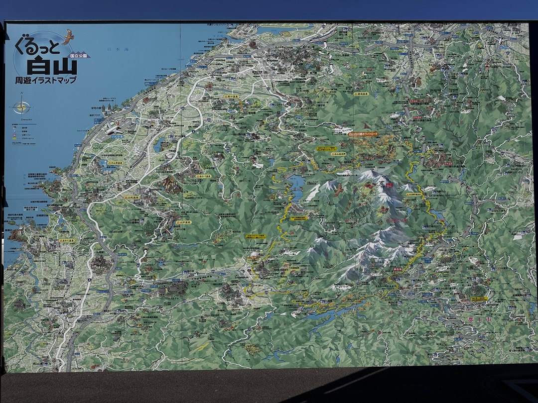 先ほどの道の駅にもありましたが北陸地方には、このようなイラストで書かれた観光地マップがあるんですよね。わかりやすくていいです。拡大してもよくわからないと思いますので、これから進むであろうところをギャラリー形式で掲載します。