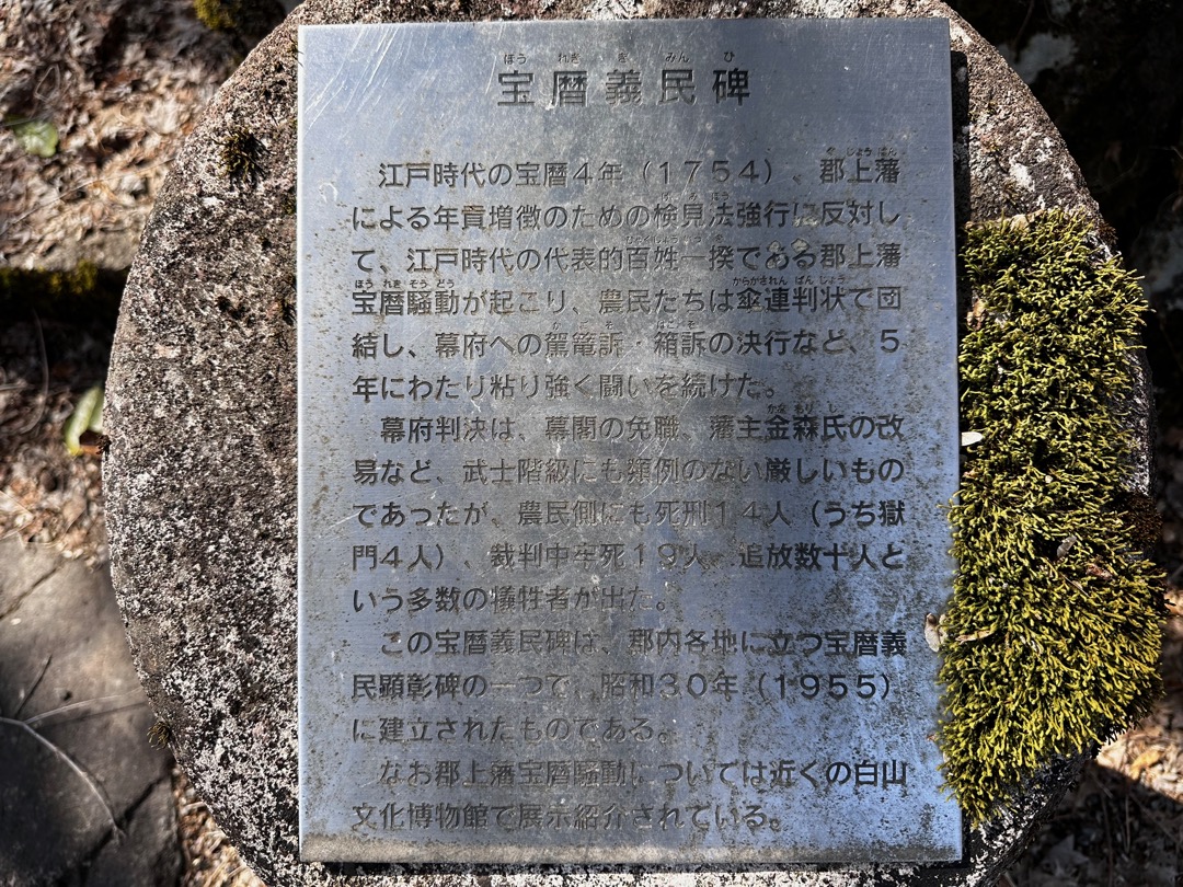 先ほど白山文化博物館で学んだ宝暦石徹白騒動の宝暦義民顕彰碑のひとつがここにありました。