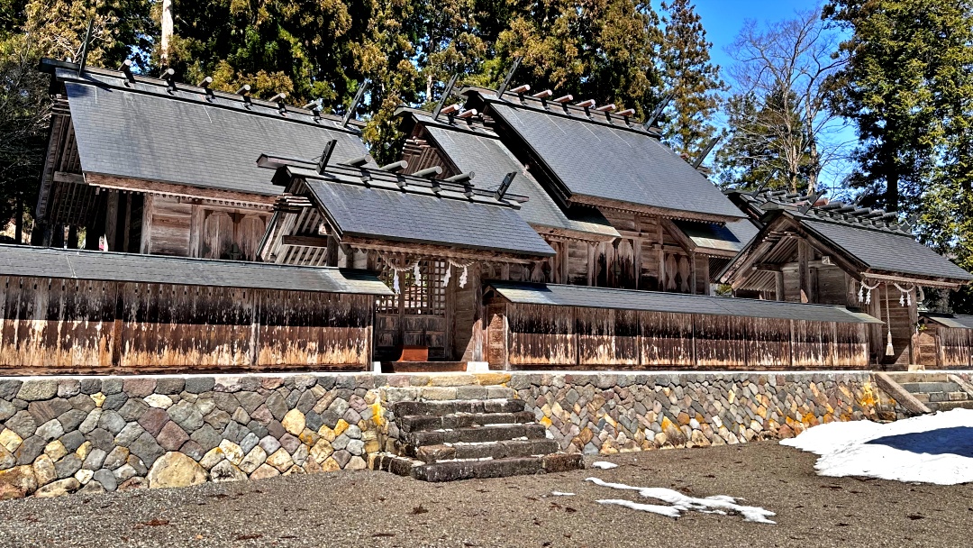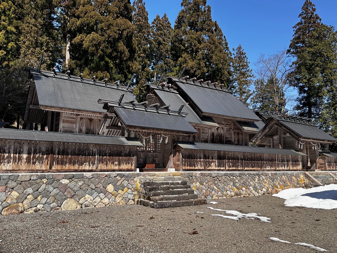 鞭懸があって、神明造りの派生型ですね。とても美しく見とれてしまいました。御祭神は、菊理姫命(くくりひめ:白山比咩神(しらやまひめのかみ)と同一神)、伊弉諾尊、伊弉冉尊です。