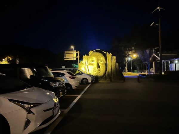 夜は街灯が点いているので真っ暗にはなりません。ただし、天之鈿女命の大きな顔がライトアップされているので、ぎょっとなります。