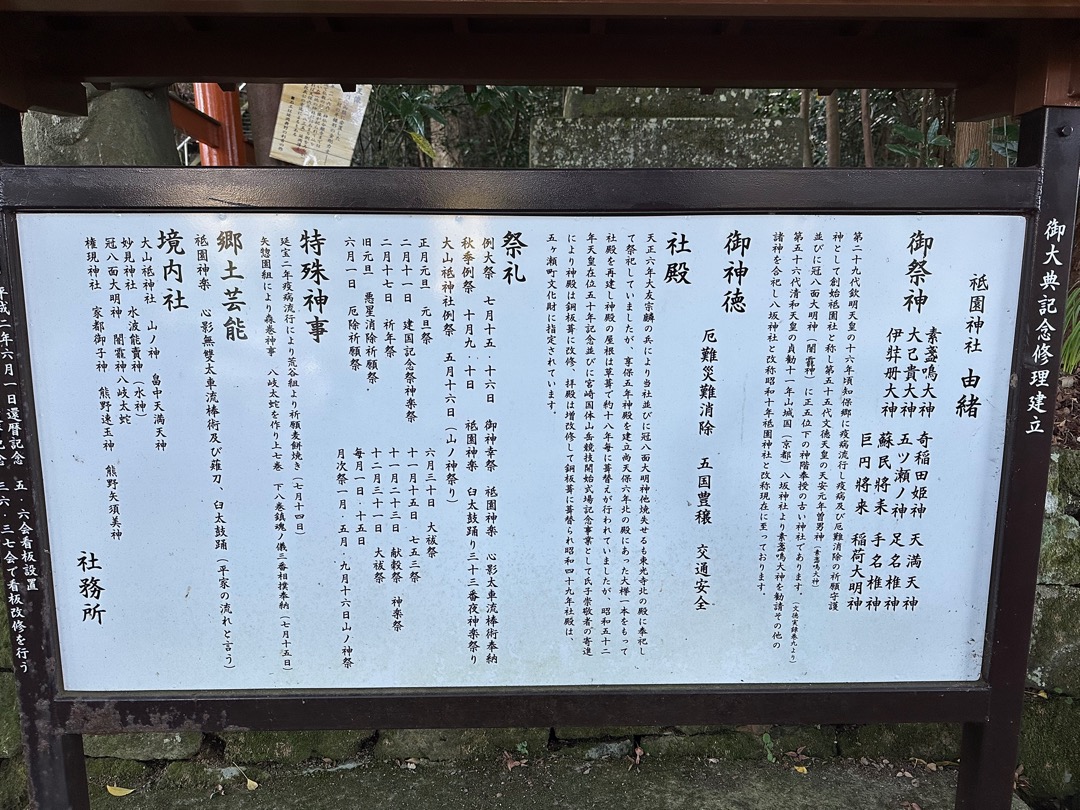 御祭神は、こちらの11柱になります。本殿の扁額が八坂神社となっておりましたが、ここに書かれているように昭和50年(1975年)に八坂神社から祇園神社へと改称したのだそうです。