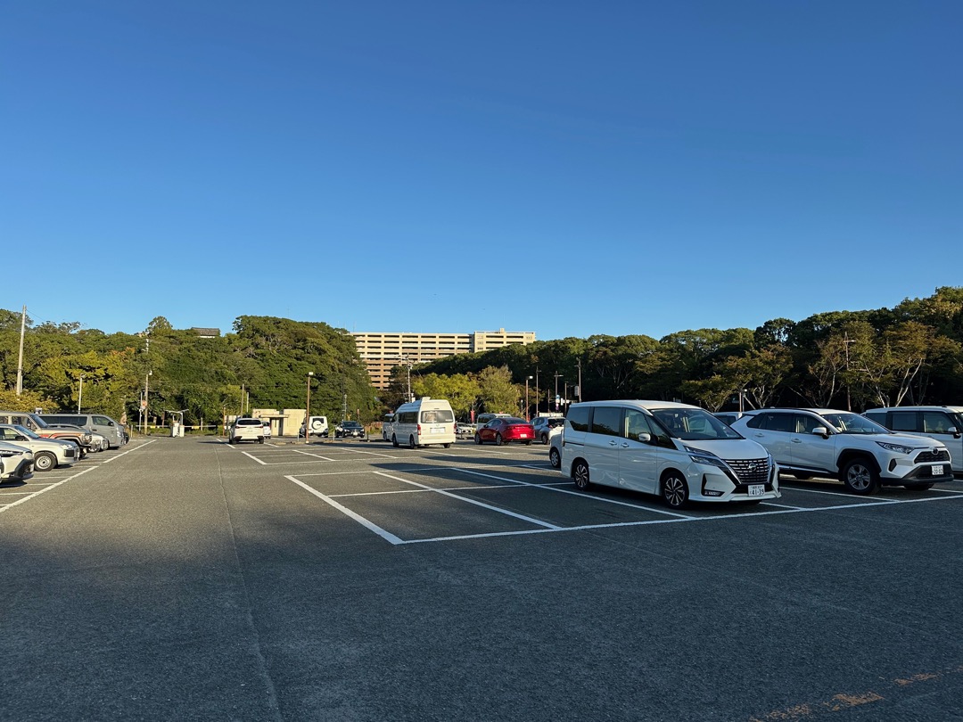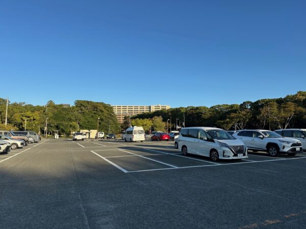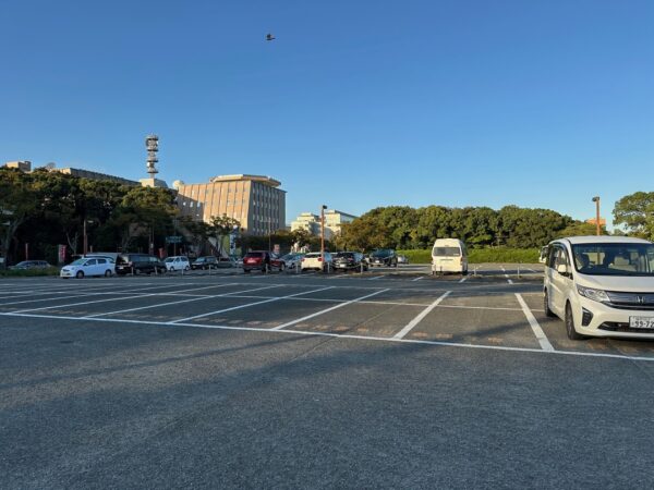 朝です。今日は快晴です。ここの駐車場は24時間以内700円です。この写真手前が参拝者専用で奥がそれ以外の人です。2つはつながっていて移動できます。