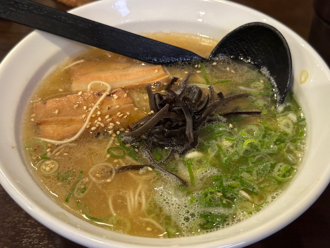 とんこつらーめん740円です。細麺でスープはあっさりとした豚骨でした。