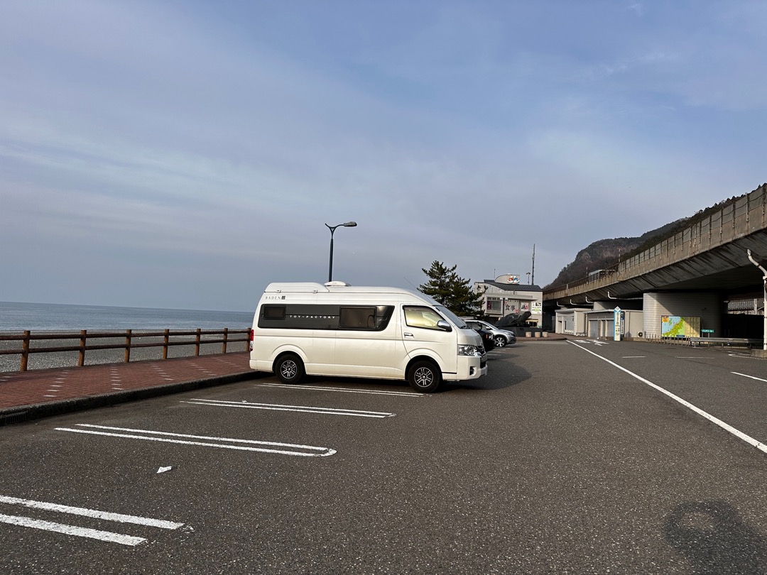 昨日お世話になった道の駅です。北陸自動車道の下に小さなお店があります。駐車場は同じく北陸自動車道の下と、右側の海沿いにあります。トイレは中央にあります。左側(富山県側)にもあったと思います。